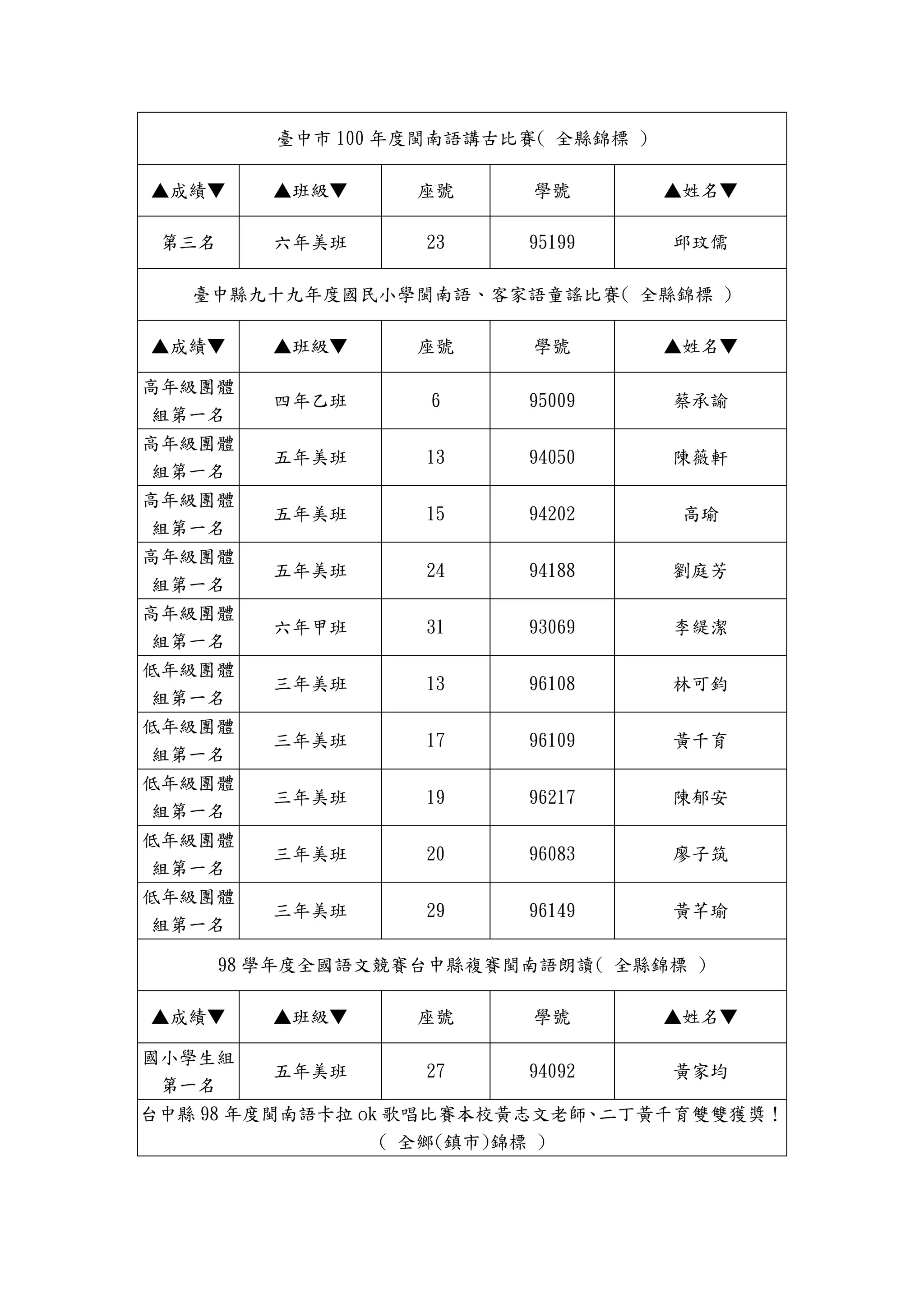 ▲班級▼ 座號 學號 ▲姓名▼ 第三名 二年丁班 18 96109 黃千育 臺中市 100 年度辦理閩南語童謠比賽( 校內活動 ) ▲成績▼ ▲班級▼ 座號 學號 ▲姓名▼ 高年級組第 四年美班 17 96109 黃千育 一名 高年級組第 四年美班 29 96149 黃芊瑜 一名 高年級組第 五年美班 17 95204 柯妘蓁 一名 高年級組第 五年美班 23 95199 邱玟儒 一名 高年級組第 六年美班 15 94202 高瑜 一名 台中縣 99 學年度國小學童閩南語、客家語小學堂搶答比賽( 縣級社團 ) ▲成績▼ ▲班級▼ 座號 學號 ▲姓名▼ 中年級組第 四年美班 14 96209 王郁晴 一名 中年級組第 四年美班 17 96109 黃千育 一名 中年級組第 四年美班 22 96206 鄭宥心 一名 高年級組第 六年美班 10 94138 魏士程 一名 高年級組第 六年美班 2 94184 洪至成 一名 高年級組第 六年美班 27 94092 黃家均 一名