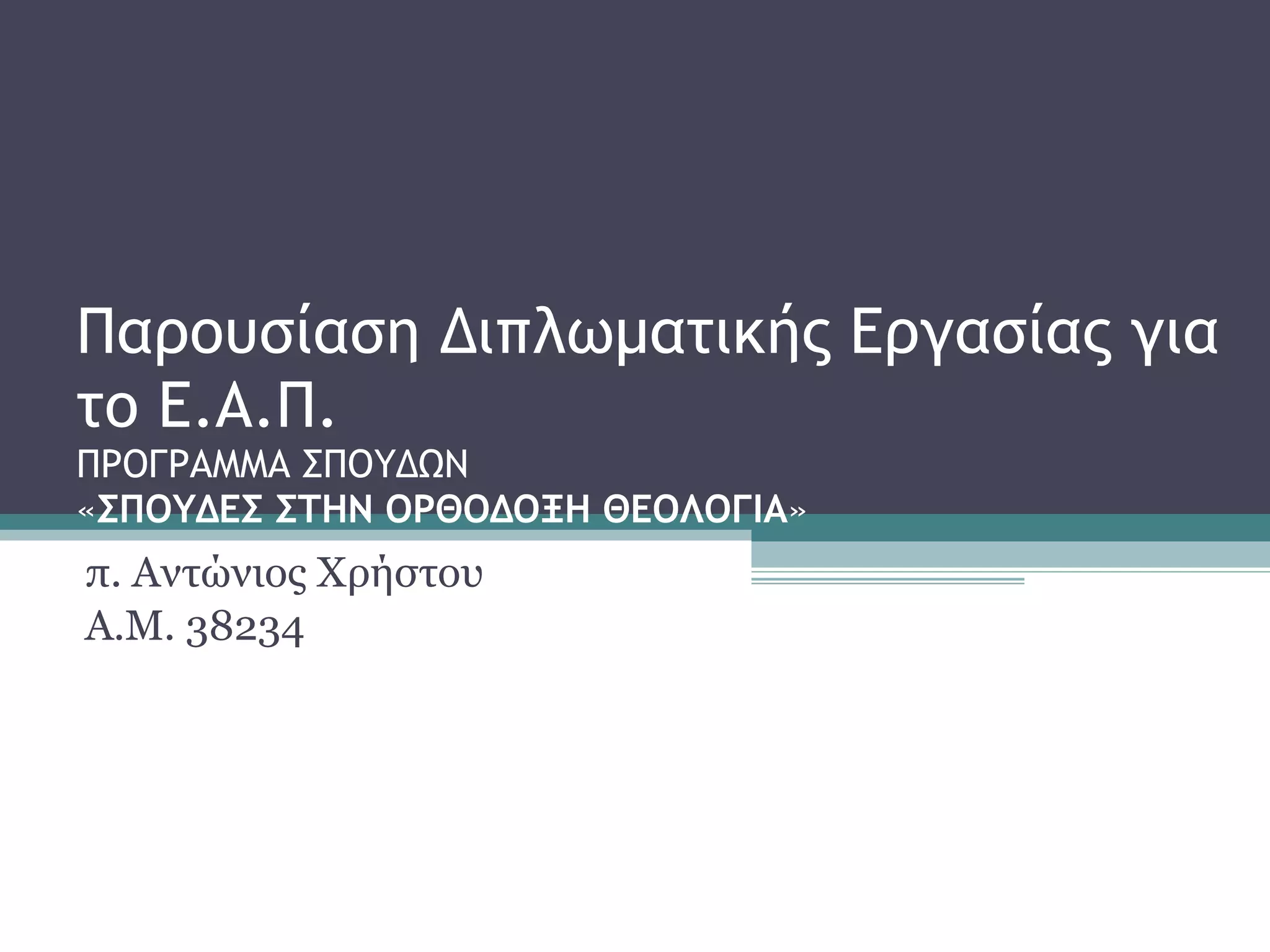 Παρουσίαση Διπλωματικής Εργασίαςγια το Ε.Α.Π. ΠΡΟΓΡΑΜΜΑ ΣΠΟΥΔΩΝ « ΣΠΟΥΔΕΣ ΣΤΗΝ ΟΡΘΟΔΟΞΗ ΘΕΟΛΟΓΙΑ » π. Αντώνιος Χρήστου Α.Μ. 38234