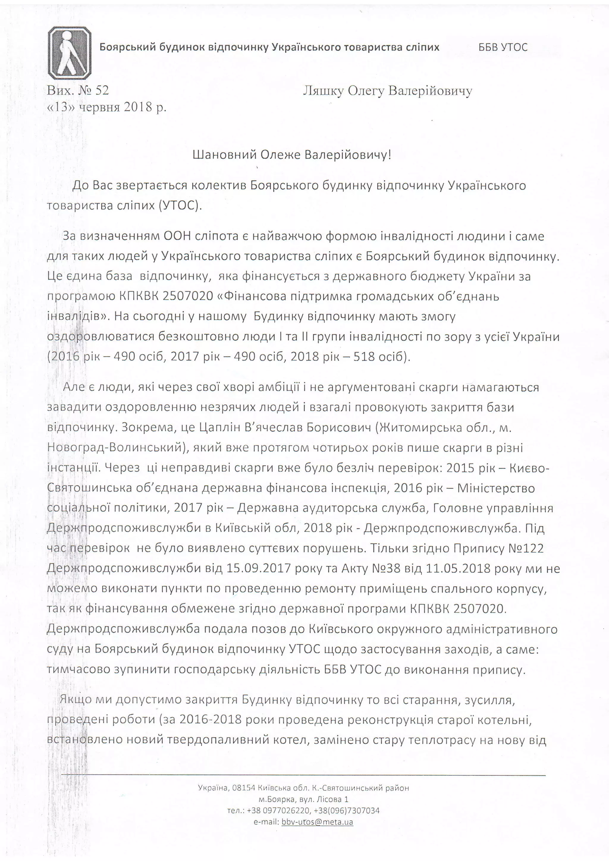 Звернення Боярського будинку відпочинку Українського товариства сліпих до Олега Ляшка