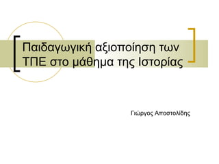 ΤΠΕ και διδακτική της ιστορίας Η ενσωµάτωση των ΤΠΕ μπορεί να γίνει με πολλούς τρόπους, όπως: Αναζήτηση ιστορικού υλικού (άμεσων και έμμεσων πηγών), λογισμικών, ιστοτόπων, φορέων, μαρτυριών. Συγγραφή. Επικοινωνία και διάδραση. Παρουσίαση, κοινοποίηση. Κατηγοροποιούμε τα αίτια (πίνακες-βάσεις δεδοµένων ή λογιστικά φύλλα, δοµώντας τα σε επεξεργαστή κειµένου κλπ.). Μελετάμε διαχρονικά ένα θέµα (λχ. με σύγκριση τεκµηρίων) αξιοποιώντας λογισµικά, διαδίκτυο. Μελετάμε συσχετίζοντας την έννοια του χρόνου µε τον χώρο και τη γεωγραφία (με κριτήρια: πολιτεύματα, οικονομία, πόλεμοι, τεχνολογία, πολιτιστικά αγαθά κλπ.). Αφηγούμαστε µε: κείµενο, εικόνα, πίνακες, γραφήµατα, διαγράµµατα, χάρτες, προφορικές μαρτυρίες, video κλπ.