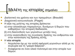 Μελέτη της ιστορίας σημαίνει Διαλεκτική του χρόνου και των πραγµάτων . ( Braudel ) Διαχρονική κοινωνιολογία . ( Piaget ) Η αξία της µελέτης της ιστορίας βρίσκεται: α) στην αποκάλυψη παραγόντων, δυνάµεων ή δοµών που καθορίζουν την ιστορική διαδικασία, β) στη διασύνδεση των γεγονότων µεταξύ τους, γ) στην ανασύνθεση της συνολικής δράσης του ανθρώπου και στην κατανόηση της δράσης αυτής. Η νέα ιστορία : Ασχολείται όχι με την απλή αφήγησή γεγονότων αλλά µε τη συγκυρία και τη "µακρά διάρκεια". Αναφέρεται σε έναν ολικό πολιτισµό και στην ιστορία των δοµών.