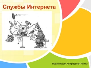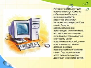 Документ обсуждает услуги интернета, акцентируя внимание на их разнообразии и изменчивости. Он описывает основные компоненты для использования этих служб и подчеркивает, что электронная почта является одной из самых популярных услуг, имеющей как достоинства, так и недостатки. Основная задача всех служб интернета заключается в предоставлении общего доступа к ресурсам.