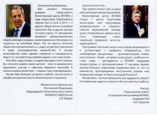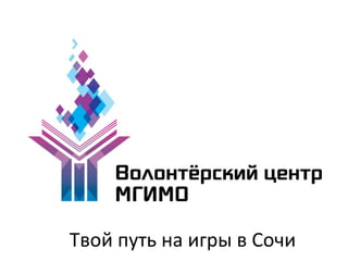 Документ описывает деятельность волонтерского центра МГИМО, который активно готовит студентов к участию в Олимпийских и Паралимпийских играх в Сочи 2014 года. Студенты принимают участие в различных мероприятиях, включая спорт, благотворительность и международные конференции, получая опыт работы в команде и навыки обслуживания делегаций. Волонтерский центр также способствует развитию добровольческого движения в России и организует множество акций, направленных на поддержку детей с ограниченными возможностями.