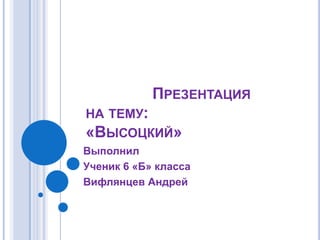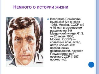 Документ представляет собой презентацию о жизни и творчестве Владимира Высоцкого, советского поэта и актёра, известного своими песнями и ролями в кино. Высоцкий родился в Москве в 1938 году, стал лауреатом государственной премии СССР и оставил после себя более 700 поэтических произведений. Упоминаются его семьи, карьера и последние дни жизни, включая похороны, состоявшиеся в 1980 году.