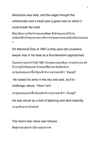 The document describes several stories of unusual accidents and deaths, as well as some near-death experiences that had happy endings. It tells the story of Aeschylus allegedly being killed when an eagle dropped a tortoise on his bald head, mistaking it for a rock. It also describes a lawyer who was struck by lightning after challenging a storm, and a woman in Prague who survived falling on her husband after jumping from a third-floor window, killing him. The document ends by relating tales of lucky escapes, such as a man surviving a 300 mph car crash in a fireball and a railroad worker whose head was pierced by a metal bar but who fully recovered.