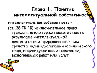 Документ описывает концепцию интеллектуальной собственности, включая её правовые аспекты, виды объектов и права, которые на них распространяются. Основное внимание уделяется авторскому праву и патентному праву, включая их задачи, источники и объекты, а также роль патентного ведомства в России. Приводится информация о лицензионных договорах и патентной информации, а также о правах патентообладателей.