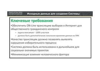 Документ содержит рекомендации по созданию системы видеотрансляций с избирательных участков в России для обеспечения прозорности выборов и гражданского контроля. Рассматриваются различные варианты оборудования и их преимущества и недостатки, а также требования к качеству трансляций и минимизации человеческого фактора. Приняты решения по использованию IP-камер, отказу от длинных USB-удлинителей и обсуждены потенциальные мобильные приложения.