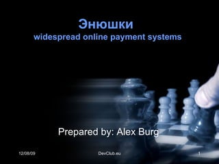 Документ рассматривает различные системы электронных денег, такие как WebMoney, e-gold и Яндекс.Деньги, предоставляя информацию о каждой из них, включая комиссии, способы работы и автоматизацию. Описаны основные характеристики и интерфейсы клиентских приложений для этих систем, а также примеры кода для интеграции. Основное внимание уделяется вопросам безопасности и скорости транзакций.