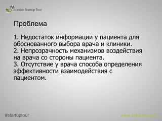 Документ описывает интерактивную систему оценки врачей и лечебных учреждений на сайте prodoctorov.ru, цель которой состоит в улучшении информированности пациентов и прозрачности взаимодействия с врачами. Представлены проблемы, такие как недостаток информации для выбора специалиста и отсутствие механизмов оценки взаимодействия. Также изложены детали монетизации, маркетинга и конкуренции в сфере информационных услуг.