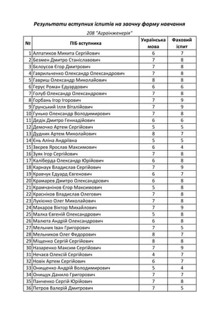 Результати вступних іспитів на основі ОКР "Кваліфікований робітник" на заочну форму навчання - Слов'янський аграрний технікум