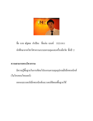 คาเปี ยง ชื่อเล่น เบนซ์ 53211811 นักศึกษาภาควิชาวิศวกรรมระบบควบคุมและเครื่ องมือวัด ชั้นปี 2 ความสามารถทางวิศวกรรม มีความรู ้พ้ืนฐานในการเขียนโปรแกรมควบคุมอุปกรณ์อิเล็กทรอนิกส์ (ไมโครคอนโทรเลอร์ ) ออกแบบวงจรอิเล็กทรอนิกส์และวงจรดิจิตอลพื้นฐานได้