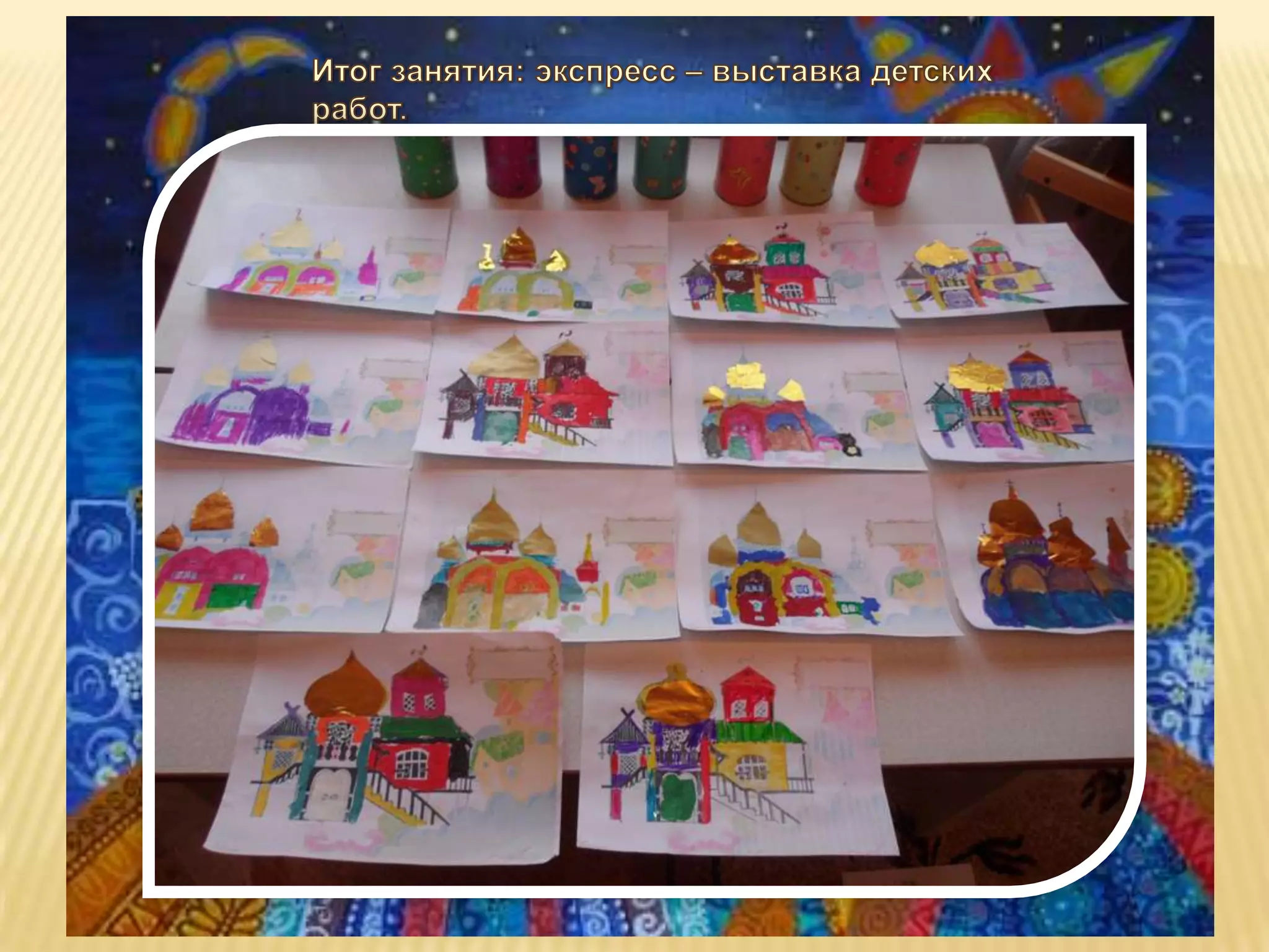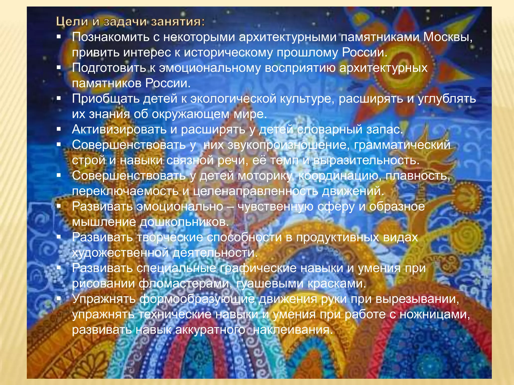 Документ описывает занятие для детей, направленное на ознакомление с архитектурными памятниками Москвы и привлечение интереса к русской культурной истории. В ходе занятия используются сказочные элементы, музыкальное сопровождение и творческие задания, чтобы развивать навыки говорения, моторики и художественного выражения у дошкольников. Также рассматриваются такие памятники, как кремль и соборы, с целью углубления знаний детей об окружающем мире.
