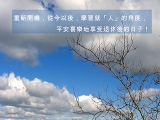 重新開機,從今以後,學習就「人」的角度, 平安喜樂地享受退休後的日子!