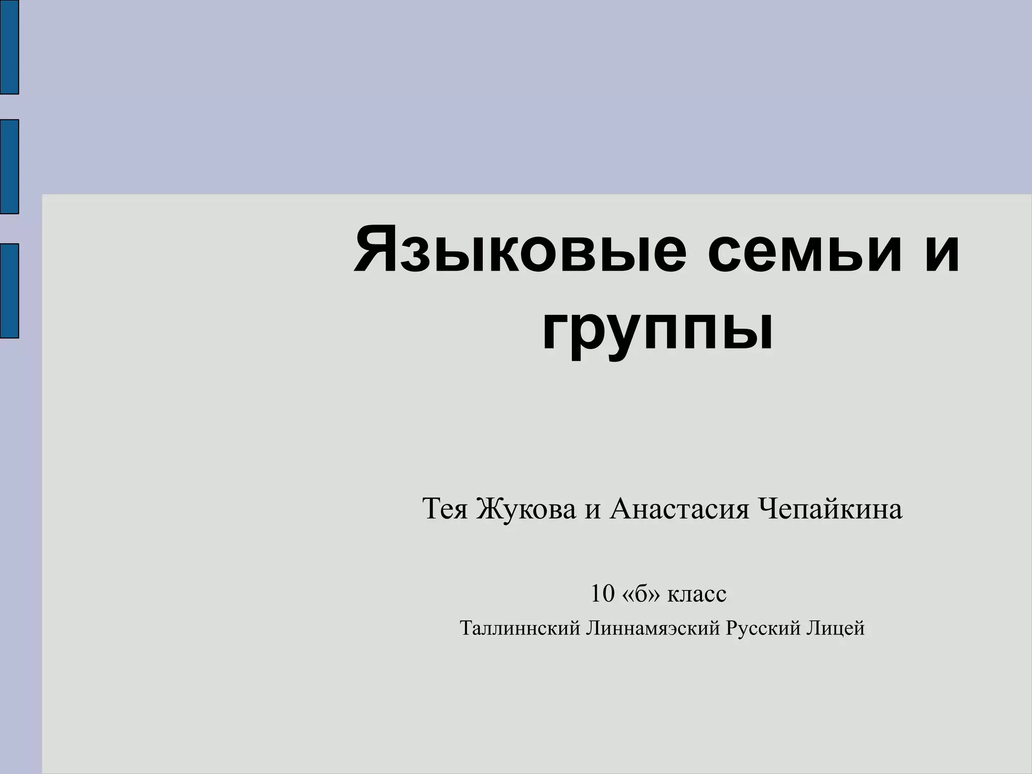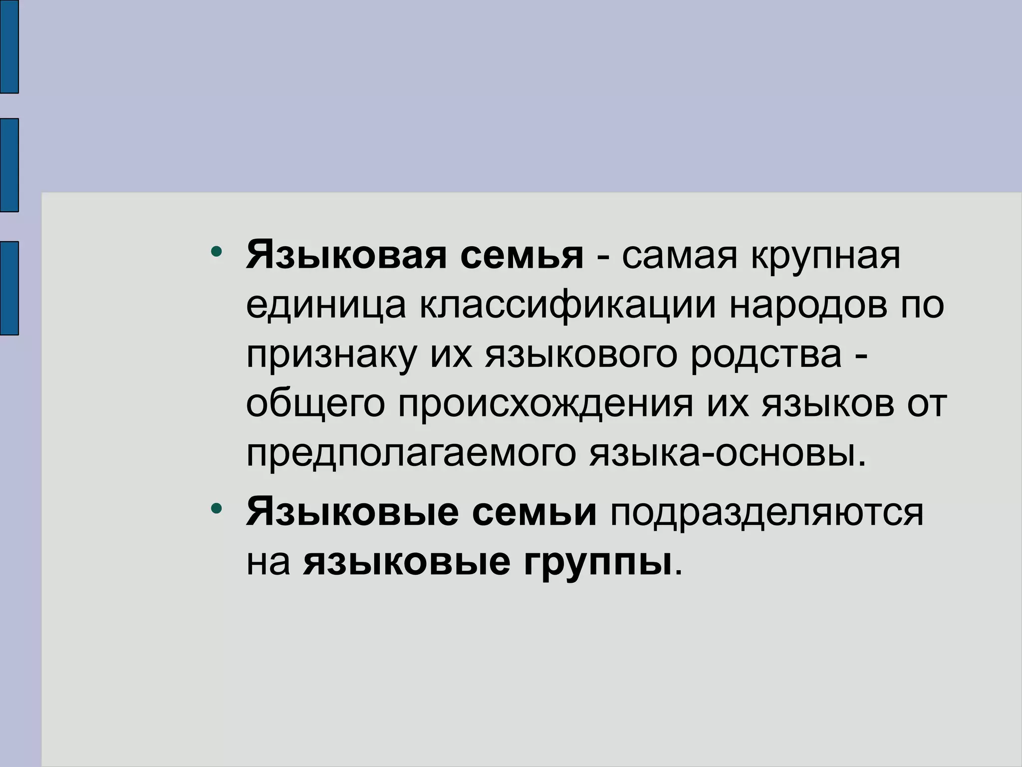 Документ описывает языковые семьи и группы, выделяя индоевропейскую семью как крупнейшую и наиболее распространённую в мире. В рамках индоевропейской семьи перечислены романская, германская и славянская группы, каждая из которых включает различные языки и народы. Также упоминаются другие языковые семьи, такие как китайско-тибетская, алтайская и уральская, с указанием представленных в них групп и языков.