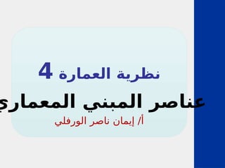 تناقش الورقة عناصر العمارة التي تؤثر في تصميم المباني، مركزةً على الفراغات الداخلية ووظائفها. يتم تقسيم العناصر إلى ثلاث فئات رئيسية تشمل الأجزاء الوظيفية للحركة والتقسيمات الفراغية، وتأثيرها على جودة الحياة داخل المبنى. كما تبرز أهمية تنظيم العلاقات بين هذه العناصر لتحقيق نجاح التصميم المعماري.