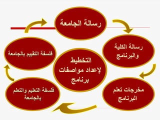 الوثيقة تناقش كيفية صياغة مخرجات التعلم وأدوات التقييم في البرامج الأكاديمية. تتضمن الموضوعات المعنية تصنيفات المخرجات، المهارات الأساسية والتخصصية، وكيفية كتابة مخرجات التعلم بشكل فعال. أهداف الوثيقة تشمل تحسين جودة التعليم وضمان تحقيق المعايير الأكاديمية المناسبة في المخرجات التعليمية.