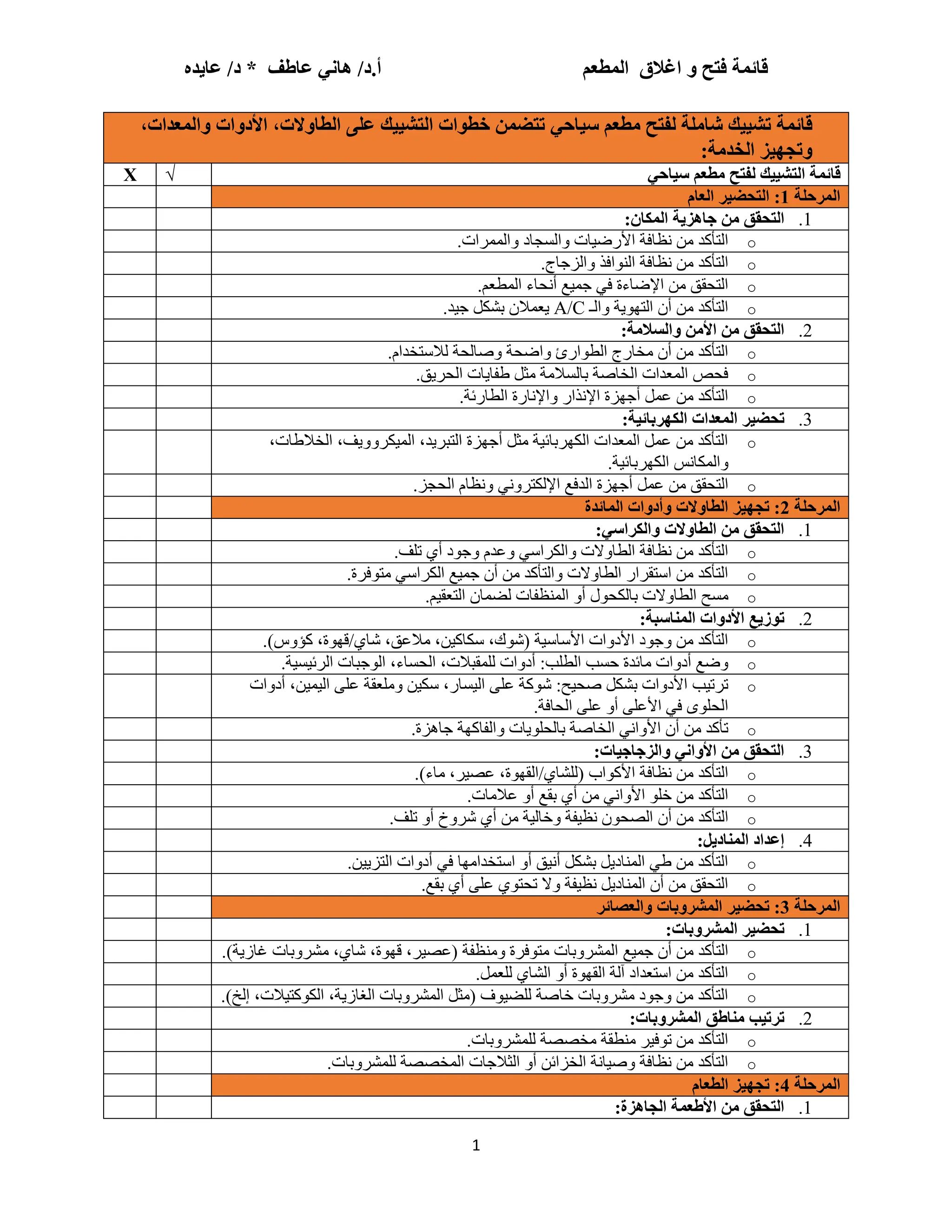 قائمة تشييك شاملة لفتح مطعم سياحي تتضمن رؤية البروفيسور هاني و الدكتوره عايده خطوات التشييك على الطاولات، الأدوات والمعدات، وتجهيز الخدمة: