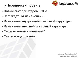 В статье обсуждаются структурные изменения сайта и их влияние на внутренние и внешние ссылочные структуры. Автор Александр Люстик предостерегает не трогать работающие элементы сайта и предлагает использовать 301 редиректы при смене домена. Ожидания по восстановлению трафика варьируются от 2-3 месяцев, в зависимости от уровня доверия к сайту и изменений в анкор-листе.