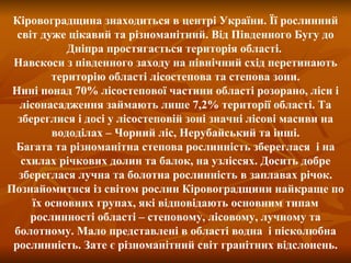Кіровоградщина знаходиться вцентрі України. Її рослинний світ дуже цікавий та різноманітний. Від Південного Бугу до Дніпра простягається територія області. Навскоси з південного заходу на північний схід перетинають територію області лісостепова та степова зони. Нині понад 70% лісостепової частини області розорано, ліси і лісонасадження займають лише 7,2% території області. Та збереглися і досі у лісостеповій зоні значні лісові масиви на вододілах – Чорний ліс, Нерубайський та інші. Багата та різноманітна степова рослинність збереглася і на схилах річкових долин та балок, на узліссях. Досить добре збереглася лучна та болотна рослинність в заплавах річок. Познайомитися із світом рослин Кіровоградщини найкраще по їх основних групах, які відповідають основним типам рослинності області – степовому, лісовому, лучному та болотному. Мало представлені в області водна і пісколюбна рослинність. Зате є різноманітний світ гранітних відслонень.