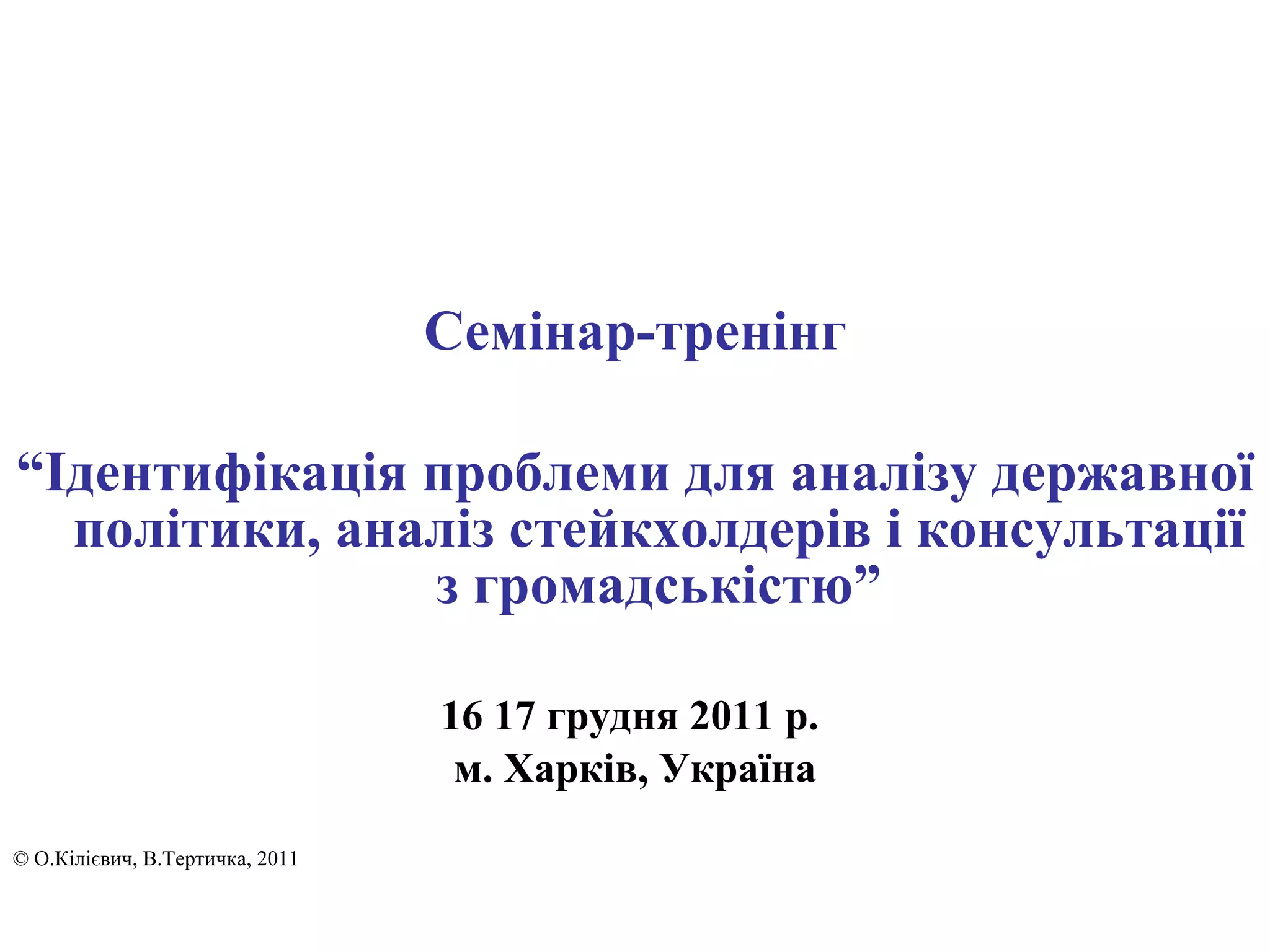 Семінар-тренінг “Ідентифікація проблемидля аналізу державної політики, аналіз стейкхолдерів і консультації з громадськістю” Олександр Іванович Кілієвич Ежена Потьє, 20, м. Київ, Україна Тел. (380 44) 456-9357 E-mail: [email_address] gov .ua http:// www . IPAS.org.ua Валерій Володимирович Тертичка Ежена Потьє, 20, м. Київ, Україна Тел. \ Факс (380 44) 45 6 - 1386 E-mail: [email_address] http:// www . IPAS.org.ua