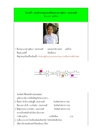 ประสาทเสรี ิ ชั้น ม. 6/3 เลขที่ 28 1. ชื่อ-สกุล นางสาวสุธนวา ประสาทเสรี ั เลขประจําตัว 42587 เลขที่ 28 ชื่อเลน เมโลดี้ กรุปเลือด O ที่อยู (ขณะเรียนที่โรงเรียนนี้) 179/39 หมูบาน City Home Place 3 ต.ตนเปาอ.สันกําแพง โทรศัพท (ที่ติดตอได) 0850369665 ภูมิลําเนาเดิม (กรณีไมไดอยูกับบิดามารดา) .. 2. ชื่อบิดา (ถามี) นายสัณฐิติ ประสาทเสรี โทรศัพท 0891911209 ชือมารดา (ถามี) นางกันทิมา ประสาทเสรี ่ โทรศัพท 0891911432 3. ชื่อผูปกครอง นางกันทิมา ประสาทเสรี โทรศัพท 0891911432 ความเกี่ยวพันธกับนักเรียน เปน มารดา อาชีพ แมบาน รายได/เดอน - ื บาท 4. จบชั้น ม.3 มาจากโรงเรียนวัฒโนทัยพายัพ จังหวังหวัดเชียงใหม เนื้อหา/วิชาคอมพิวเตอร ที่เคยเรียนมา ไดแก