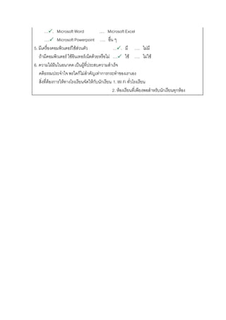 Word …. Microsoft Excel …. Microsoft Powerpoint …. อน ๆ ่ื 5. มเี ครองคอมพวเตอรใชสวนตว ่ื ิ ั … . มี …. ไมมี ถามีคอมพิวเตอร ใชอินเทอรเน็ตดวยหรือไม …. ใช …. ไมใช 6. ความใฝฝนในอนาคต เปนผูที่ประสบความสําเร็จ คติธรรมประจําใจ พรใดก็ไมสําคัญเทาการกระทําของเราเอง สิ่งที่ตองการใหทางโรงเรียนจัดใหกับนักเรียน 1. Wi Fi ทั่วโรงเรียน 2. หองเรียนที่เพียงพอสําหรับนักเรียนทุกหอง