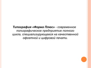 Типография «Форма Плюс», основанная в 2002 году, специальизируется на качественной офсетной и цифровой печати, выходя на рынок с современным оборудованием из различных стран. В 2011 году была запущена третья линия офсетной печати, предоставляющая дополнительные возможности защиты продукции. Компания предлагает широкий спектр печатной продукции, включая упаковку, рекламные материалы и бланки, с доставкой по указанному адресу.