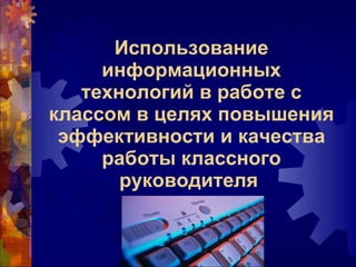 Документ представляет план выступления на конференции о воспитательной системе, акцентируя внимание на использовании информационных технологий в работе классного руководителя. Обсуждаются различные инструменты, такие как Microsoft Access и Excel, для создания баз данных класса и учета успеваемости учащихся, а также создание сайта и использование презентаций для родительских собраний. Завершается гостиным словом, подчеркивающим важность личного примера в воспитании.