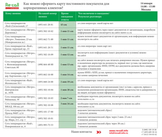 Документ содержит информацию о процессе оформления карты постоянного покупателя для корпоративных клиентов в сети гипермаркетов 'Метро' и 'Real'. Указаны необходимые документы, контактные номера телефонов и результаты обращений, включая недозвоны. Основная информация сосредоточена на требованиях к пакету документов для оформления карты.