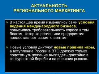 Документ посвящен региональному маркетингу города Чебоксары, подчеркивая его актуальность в контексте международного бизнеса и конкурентных изменений. Автор описывает роль целевых групп, таких как население, предприятия и государственные органы, в формировании имиджа региона и необходимости комплексной работы над улучшением каждого уровня. Также обсуждаются преимущества позиционирования регионов и примеры успешного брендирования, в том числе создание уникальных маркетинговых продуктов и стратегий, направленных на повышение привлекательности города.
