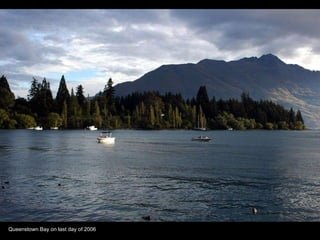 Alton spent nine months traveling around New Zealand from June 2006 to March 2007, capturing photos from the country's three main seasons - spring, summer, and winter. The document contains over 50 photos chronicling Alton's experiences in various regions of New Zealand, including Queenstown, Dunedin, Nelson, Stewart Island, Picton, Lake Tekapo, Timaru, Tongariro, Mount Cook, Lake Wanaka, Auckland, the southwest islands, Lake Matheson, Fox Glacier, and Kaikoura. The photos provide a visual diary of Alton's working holiday exploring New Zealand's diverse landscapes and seasonal changes over three seasons.