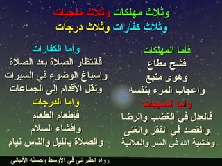 تتضمن الوثيقة أحاديث نبوية تتحدث عن ثلاثيات تتعلق بالإيمان، المهلكات، المنجيات، والدعوات المستجابة. كما تشمل توجيهات حول الأخلاق الإسلامية، وحقوق المسلم، والأعمال الصالحة التي تضمن الثواب في الآخرة. تشدد الوثيقة على أهمية الالتزام بتعاليم الإسلام لبلوغ السعادة والفوز بالجنة.