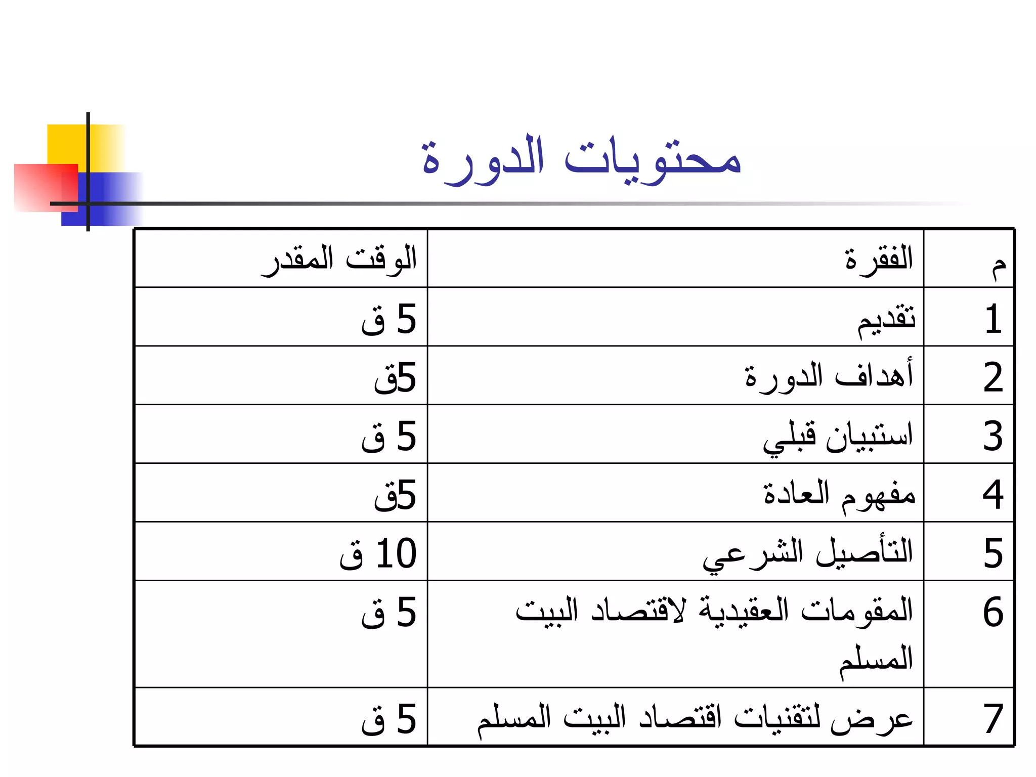 تتناول الدورة اقتصاديات الأسرة المسلمة، حيث تسلط الضوء على تقنيات تنظيم الميزانية وضرورة التخطيط المالي السليم ضمن إطار إسلامي. تشمل الدورة مواضيع مثل الاستدانة، الادخار، وتنمية مهارات الأبناء في التعامل مع المال، مع التأكيد على أهمية القيم العقيدية والشرعية في إدارة المال. تشمل الأهداف المعرفية والوجدانية تطوير الوعي الاقتصادي واستراتيجيات تحسين الوضع المالي للأسرة.