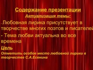 Презентация посвящена любовной лирике Сергея Есенина, её развитию и значению в творчестве поэта. Основные задачи исследования включают анализ вдохновительниц и динамики темы любви в его стихах, от ранних произведений до более поздних, насыщенных философскими размышлениями и критикой человеческих отношений. Творчество Есенина отражает разнообразие эмоциональных состояний, связанных с любовью, от нежности до озлобленности.