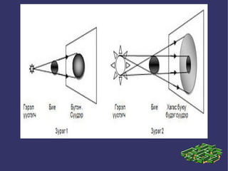 С үүдэр байгаахэсэгт гэрэлийн энерги байхгүй. Лааны гэрэлд биеийн бүтэн сүүдэр үүсдэг. 2. Том хэмжээний гэрэл үүсгэгч нь жигд биш гэрэлтүүлэлттэй сүүдэр үүсгэнэ. Үүнийг хагас буюу бүдэг сүүдэр гэнэ. Зураг 2 3. Гэрэл шулуун тарах чанарыг ашиглан жижиг нүхээр биеийн дүрсийг үүсгэж болно. А1 В1 гэрэлт цэгийн бөөгнөрөл нь биеийн дүрс болно. Кино гарах зарчим үүн дээр үндэслэнэ. - 8.