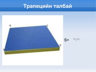 Цлиндр Хажуу гадаргууталбай нь тойргийн уртыг өндрөөр үржүүлсэнтэй тэнцүү Суурийн талбай нь Бүтэн гадаргуу талбай нь хажуу гадаргуу талбай дээр суурийн талбайг хоёр дахин авч нэмсэнтэй тэнцүү - 4.