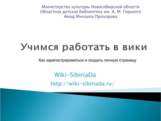 Документ содержит инструкции по регистрации и созданию личной страницы на сайте wiki-sibiriada, включая рекомендации по выбору имени пользователя и безопасности личных данных. Он также описывает правила редактирования страниц, загрузки изображений и общения с другими участниками. В документе подчеркивается важность соблюдения авторских прав и правильного оформления материалов.