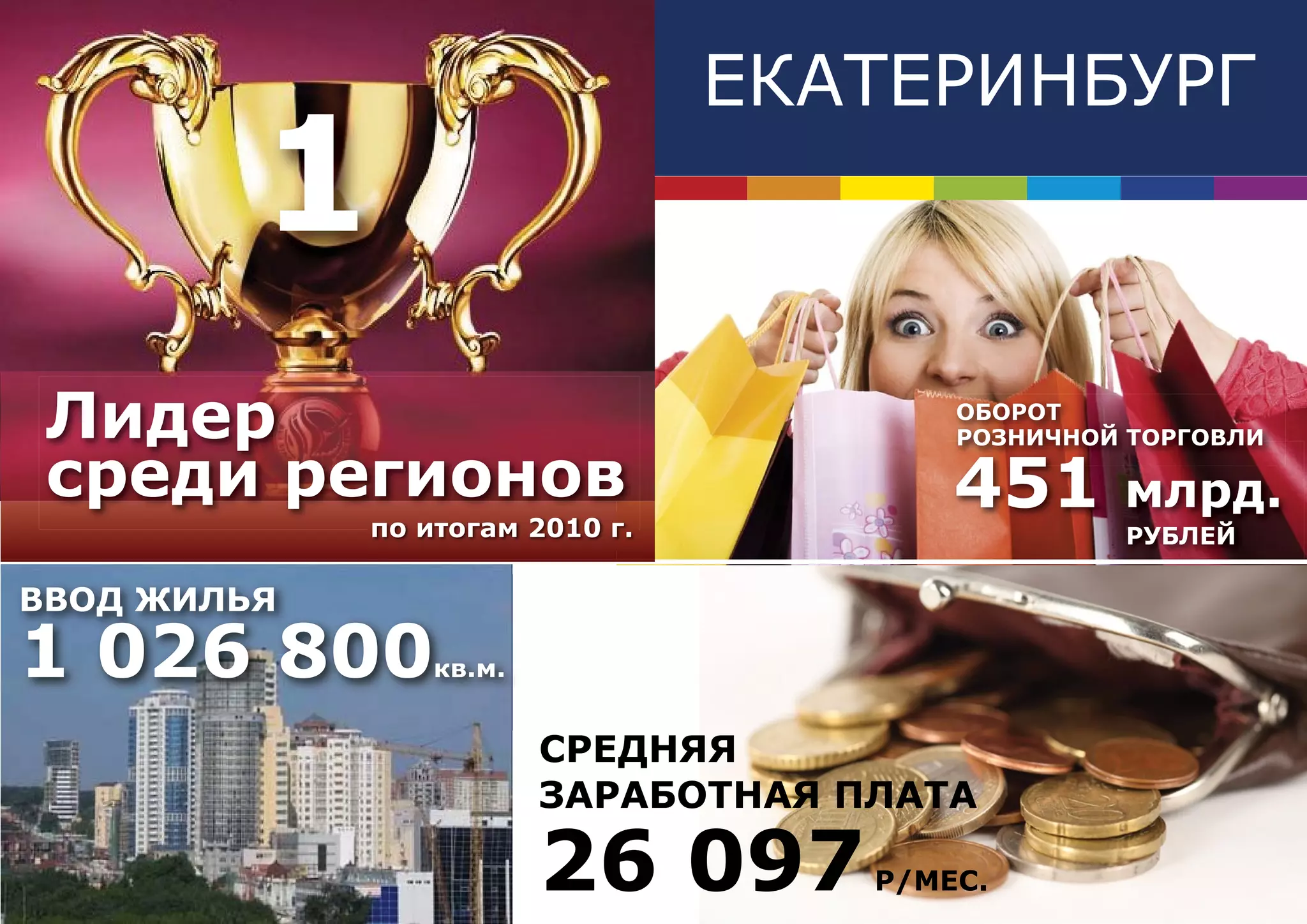 Екатеринбург является лидером по обороту розничной торговли среди регионов России с показателем 451 млрд рублей в 2010 году. Средняя заработная плата составила 26 097 рублей в месяц, при этом наблюдается рост ввода жилья и крупных торговых центров. Также в городе представлено 250 международных сетевых брендов, а население Экаеринбурга и его спутников достигает 4,39 млн человек.
