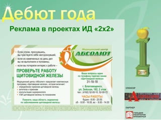 Документ содержит информацию о Москове, Ильиничне Мошконовой, которая является директором и ответственным за рекламу в проектах ИД «2х2». Основное внимание уделяется рекламе в рамках указанных проектов. Повторение фразы свидетельствует о важности данного аспекта в обсуждении.