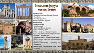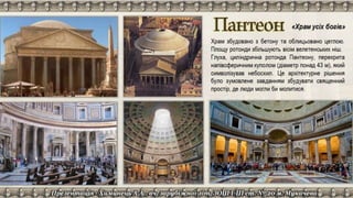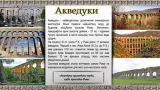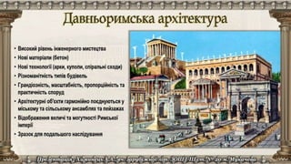 Документ содержит ссылки на различные ресурсы о древнем Риме, включая архитектуру, акведуки, дороги и термы. В нем представлены видео и статьи, которые углубляют понимание исторических объектов и инженерных достижений Рима. Основное внимание уделяется значимости римских сооружений и их влиянию на современный мир.