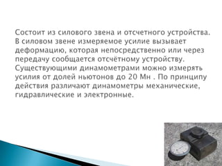 Документ описывает различные типы динамометров, включая пружинные, рычажные, гидравлические и электрические, с указанием их принципов работы. Первые приборы для измерения силы были весами, с развитием которых появились более удобные устройства, использующие пружину. Упоминаются значимые изобретения в области динамометрии, такие как устройства с циферблатом и современные динамометры различных типов.