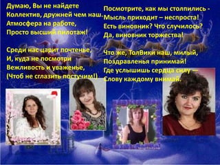 Документ представляет собой поздравление коллективу по случаю пятилетнего юбилея их работы. В нем выражаются благодарности за профессионализм и поддержку, а также пожелания успеха и счастья. Творческое и дружеское настроение пронизывает текст, подчеркивая смысл единства и совместной работы.