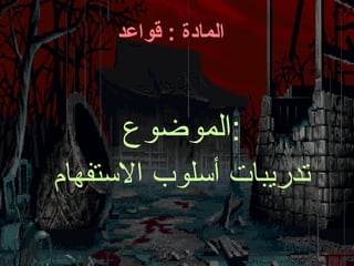 تتناول الوثيقة تدريبات أسلوب الاستفهام في اللغة العربية، حيث تقدم مجموعة من الأسئلة وممارسات متنوعة لتدريب الطلاب على استخدام الكلمات الاستفهامية مثل 'أين'، 'كم'، و'ما'. وتنظم التدريبات بشكل يساهم في تعزيز فهم الطلاب لمهارات الاستفهام وتطبيقاتها المختلفة.