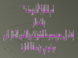 تتناول الوثيقة استنتاج معادلة الدائرة استنادًا إلى مركزها وطول نصف قطرها، مع توضيح الأهداف التفصيلية التي تشمل تحديد إحداثيات المركز ونقطة على المحيط. يتم استخدام قانون طول القطعة المستقيمة للوصول إلى المعادلة، مع تقديم مثال عملي لشرح كيفية العمل. يشكر الكاتبة المعلم أكرم ويعبر عن تمنياتها بالتوفيق للجميع.