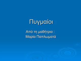 Έχουν ύψος κάτωαπό 1,50 μ. κι έχουν λίγο πεταγμένο σαγόνι. Αναφορές στους Πυγμαίους υπάρχουν στην ιστορία από αρχαιοτάτων χρόνων, την εποχή του Ηρόδοτου ή του Ομήρου. Σήμερα οι Πυγμαίοι βρίσκονται στα τροπικά δάση της Αφρικής καθώς και στη χερσόνησο του Μαλέυ, τις Φιλιππίνες, την κεντρική Νέα Γουινέα και τα νησιά Ανταμάν της Ινδίας.