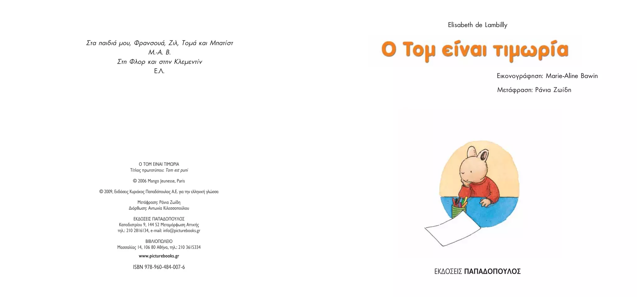 ðáéäéÜ ìïõ, ÖñáíóïõÜ, Æéë, ÔïìÜ êáé Ìðáôßóô Ì.-Á. Â. Óôç Öëïñ êáé óôçí Êëåìåíôßí Å.Ë. ÅéêïíïãñÜöçóç: Marie-Aline Bawin ÌåôÜöñáóç: ÑÜíéá Æùßäç Ο ΤΟΜ ΕΙΝΑΙ ΤΙΜΩΡΙΑ Τίτλος πρωτοτύπου: Tom est puni © 2006 Mango Jeunesse, Paris © 2009, Eκδόσεις Kυριάκος Παπαδόπουλος Α.Ε. για την ελληνική γλώσσα Μετάφραση: Ράνια Ζωίδη Διόρθωση: Αντωνία Κιλεσσοπούλου EKΔΟΣΕΙΣ ΠΑΠΑΔΟΠΟΥΛΟΣ Καποδιστρίου 9, 144 52 Μεταμόρφωση Αττικής τηλ.: 210 2816134, e-mail: info@picturebooks.gr ΒΙΒΛΙΟΠΩΛΕΙΟ Μασσαλίας 14, 106 80 Αθήνα, τηλ.: 210 3615334 www.picturebooks.gr ISBN 978-960-484-007-6 ΕΚΔΟΣΕΙΣ ΠΑΠΑΔΟΠΟΥΛΟΣ