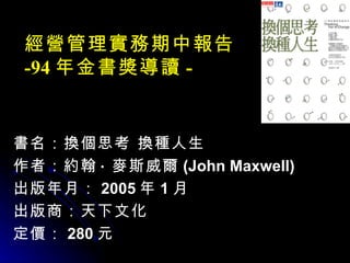 本文件是关于约翰·麦斯威尔所著书籍《换个思考 换种人生》的期中报告,强调改变思维模式对成功的重要性。书中探讨了思维模式的价值、改变思维的影响力以及如何精通思考流程,并提供多个思考技巧模拟成功的过程。最终,鼓励读者整合思维零件,进而实现个人成长与成功。