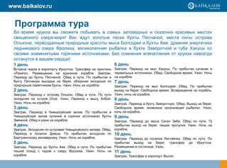 Круиз по озеру Байкал в 2012 году предлагает путешественникам уникальную возможность посетить заповедные места, включая о. Ольхон и бухты с термальными источниками. Программа включает экскурсии, рыбалку и отдых на борту, с предоставлением всего необходимого питания и комфортного размещения. Участники смогут насладиться красотой природы и получить незабываемые впечатления от путешествия.