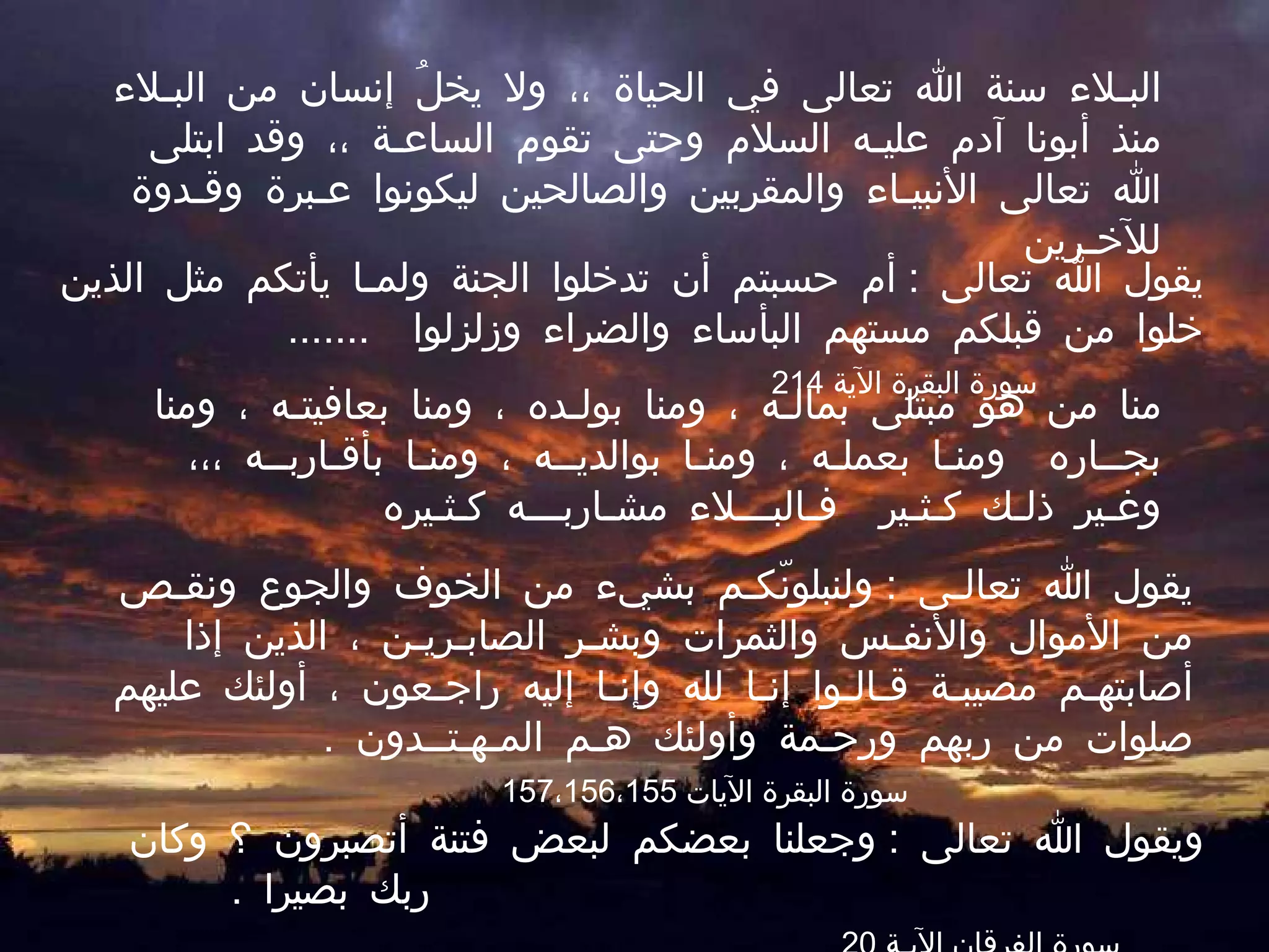يتناول النص مفهوم البلاء كجزء من السنة الإلهية في حياة الإنسان، موضحًا أن الصبر على المصائب يُعتبر من صفات المؤمنين. يُستشهد بالآيات القرآنية والأحاديث النبوية لدعم الفكرة بأن جميع بلاءات الحياة مُعدّة ومقدّرة من الله، وأن الصبر يعدّ من أهم الوسائل التي تُقرب العبد إلى الله وتكفر عن سيئاته. يؤكد النص على أهمية الرضا بالقضاء والقدر، وأن الفرج يأتي بعد الشدة، وينبغي للمؤمن أن يكون صابرًا ومحتسبًا في وجه البلاء.