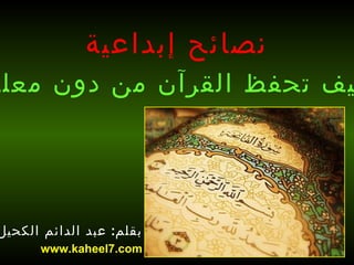 تقدم الوثيقة نصائح حول كيفية حفظ القرآن بدون معلم، مشددة على أهمية النية الصادقة وأثر حفظ القرآن على تحسين الحياة النفسية والصحية. تتضمن النصائح تكرار الاستماع للآيات وتقسيم السور إلى مقاطع، بالإضافة إلى أهمية التزام الحفظ اليومي واستغلال الأوقات المناسبة مثل فترة الصيام. يشير الكاتب أيضًا إلى فوائد حفظ القرآن في الاستشفاء الروحي والجسدي وضرورة التعليم المبكر للأطفال.